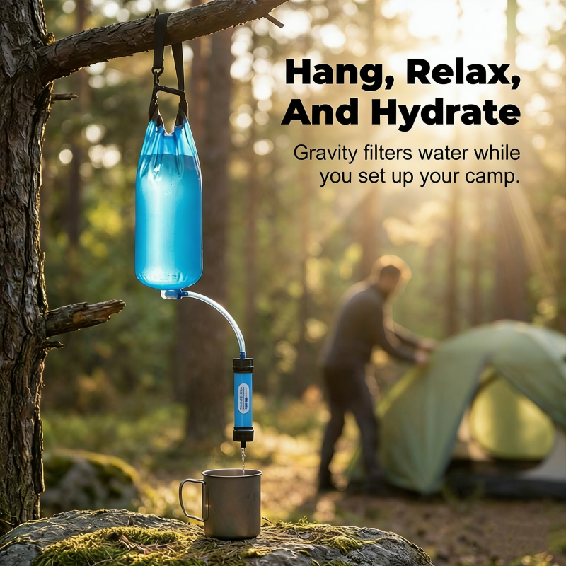 VAIVATON KÄDET VAPAA -SUODATUS – Sano hyvästit uuvuttavalle manuaaliselle pumppaukselle. Täytä vain pussi, ripusta se puuhun tai ajoneuvoon ja anna painovoiman huolehtia tasaisesta puhdistetun veden virtauksesta.